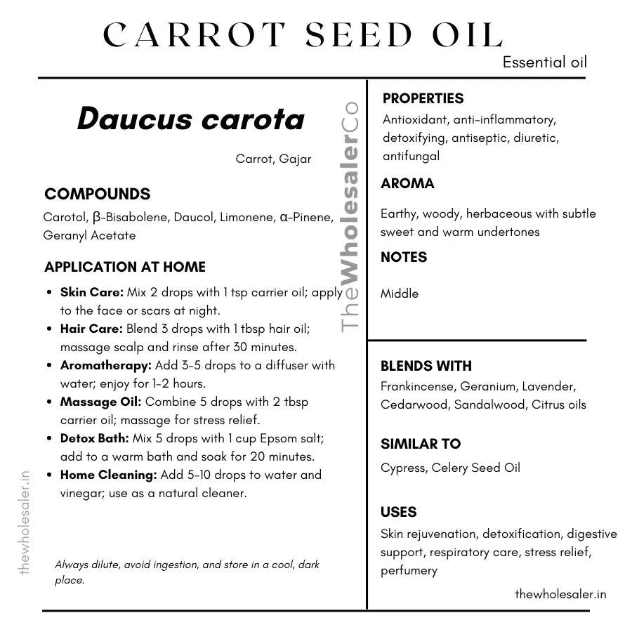 Das ätherische Karottenöl , auch Gajar-Samenöl genannt, wird aus den Samen einer Pflanze, die botanisch als Daucus carota bekannt ist, dampfdestilliert.